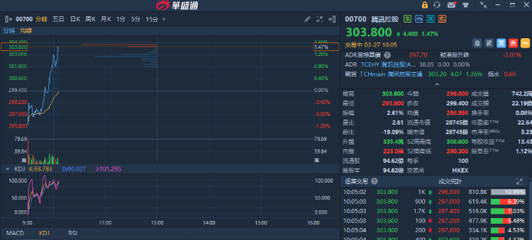 华盛资讯3月27日讯,腾讯控股股价快速拉升,现涨超1%,报303.8港元。