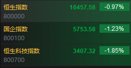 3月27日消息,今日港股三大指数集体走低,截止发稿,恒生指数跌0.97%,报16457.58点,恒生科指跌1.85%,国企指数跌1.23%。盘面上,科网股普遍下跌,百度跌近5%,小米、京东、阿里巴巴、美团跌超2%,惟腾讯逆势涨超2%,传其将为Apple Vision Pro提供多款热门应用;汽车股齐挫,造车新势力方向领跌,零跑跌超8%,锂电池、特斯拉概念股跟随走低,天齐锂业、赣锋锂业跌超3%;半导体概念股跌幅居前,上海复旦跌超4%;内房股齐跌,碧桂园跌超7%领跌;蒙牛乳业绩后挫近9%领跌恒指成分股;黄金股全天强势,招金矿业涨超5%;煤炭股普遍走高,易大宗涨超7%。