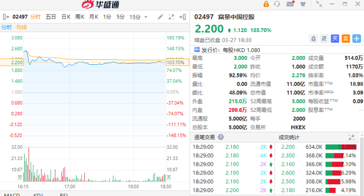 富景中国控股(02497)公布配发结果,公司全球发售1亿股股份,公开发售占14.62%,配售占85.38%。最终发售价每股1.08港元,全球发售净筹4821万港元。每手2000股,预期股份将于2024年3月28日(星期四)上午九时正开始在联交所买卖。