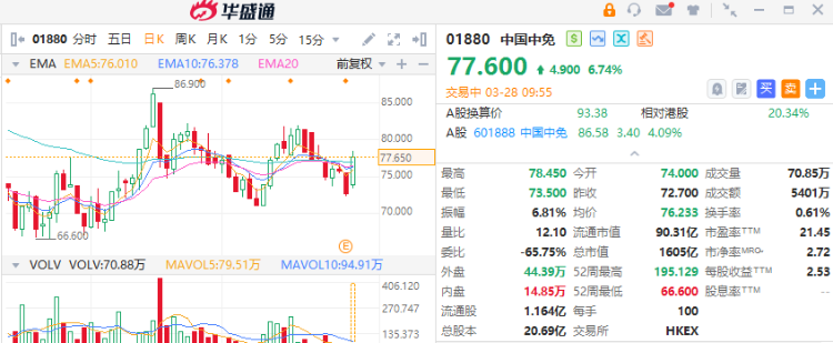 中国中免(01880)绩后涨超6%,截至发稿,涨6.74%,报77.6港元,成交额5401万港元。