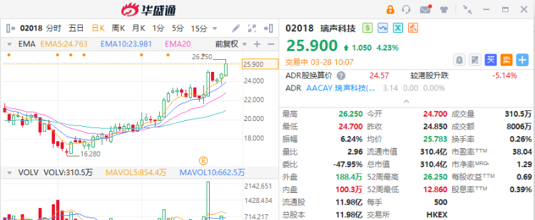 瑞声科技(02018)再涨超4%,月内累计涨幅已超30%。截至发稿,涨4.23%,报25.9港元,成交额8006万港元。