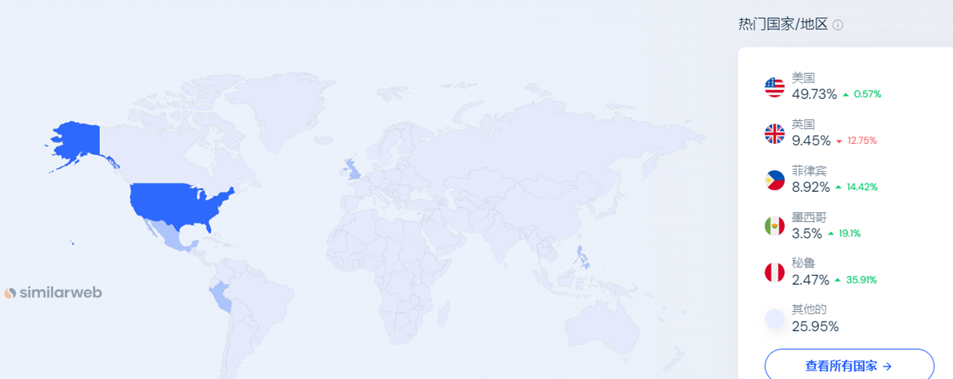 Similarweb数据显示,网站最近日访问量峰值约19.02万人。今年2月Gauth的美国访问量近半,英国、菲律宾、墨西哥、秘鲁分别占比9.45%、8.92%、3.5%、2.47%。