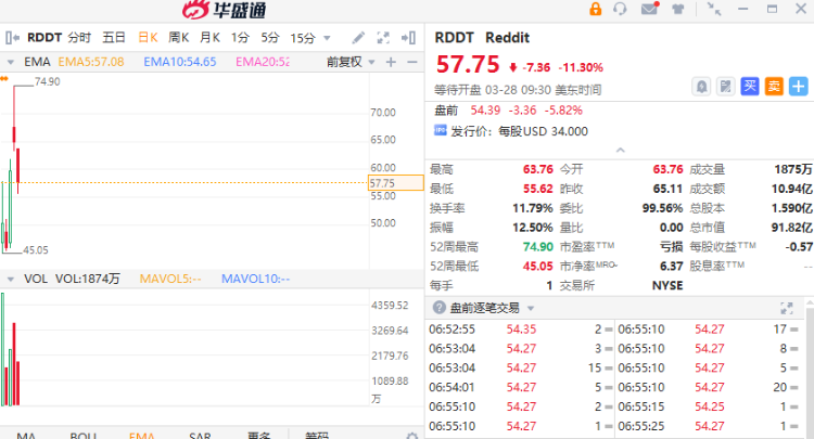 Reddit则为Interactive Brokers上交易量第四大的公司,该公司于上周四在纽交所上市,发行价为34美元,开盘首日即涨38.2%,尽管隔夜美股下跌11%至58美元,但股价仍较发行价大涨70%。