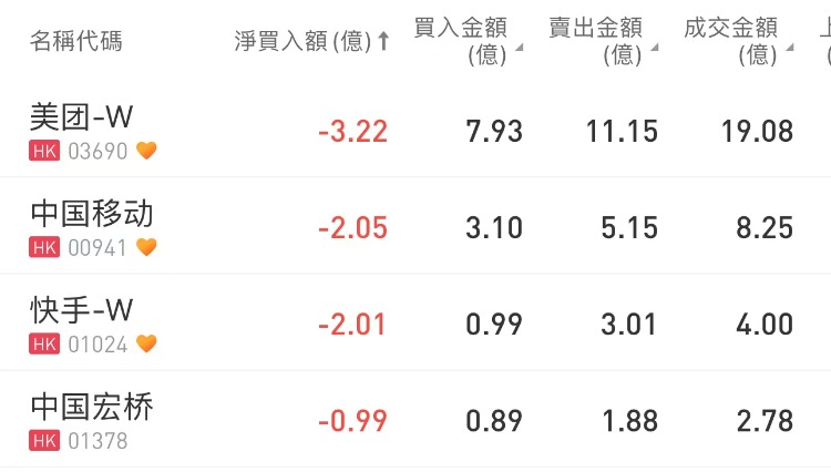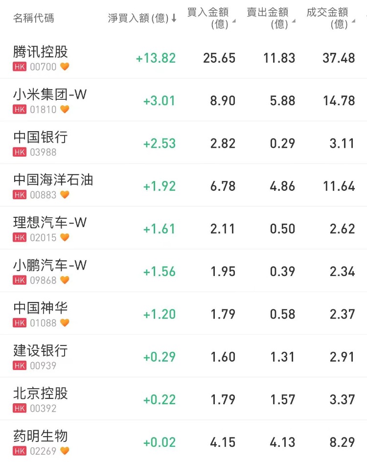 其中,南向资金净买入腾讯13.82亿港元、小米3.01亿港元、中国银行2.53亿港元、中海油1.92亿港元、理想汽车1.61亿港元、小鹏汽车1.56亿港元;净卖出美团3.22亿港元、中国移动2.05亿港元。
