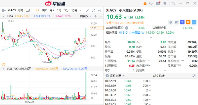 华盛资讯3月28日讯,小米集团ADR $XIACY 早盘涨势持续扩大,截至发稿涨超12%,旗下小米汽车SU7 大定订单突破5万台。