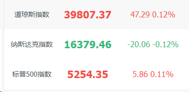 周四美股,三大指数中仅纳指收跌,跌幅0.12%,报16379.46点,在周三反弹后回落,本周仅周三收涨。标普收涨0.11%,报5254.35点,连续两日刷新上周四所创的收盘最高纪录,道指收涨47.29点,涨幅0.12%,报39807.37点,刷新上周四所创的收盘历史高位,均连涨两日。