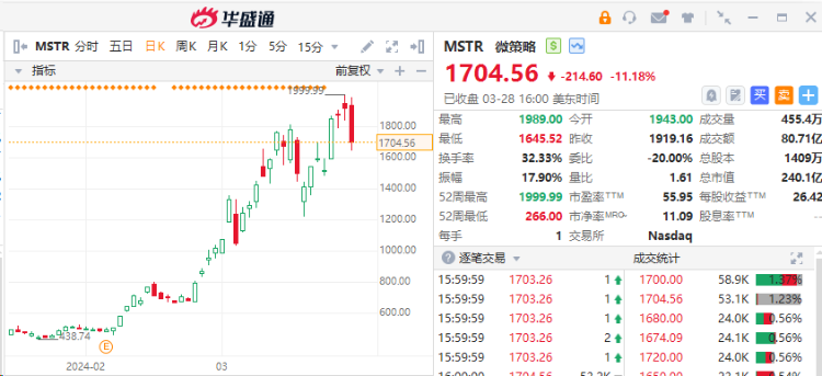 卖空投资公司Kerrisdale Capital今日发布报告称,该公司做多比特币,但做空MicroStrategy$MSTR,后者是比特币的代理。MicroStrategy一度跌超5%,截至收盘,该股跌超11%。
