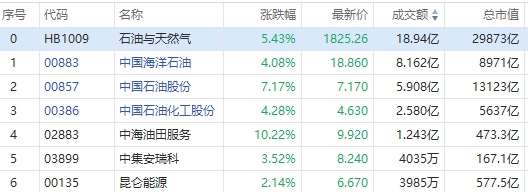 华盛资讯4月2日讯,港股早盘高开高走,油气股领涨大市。截至发稿,中国石油股份大涨超7%,中海油田服务涨超10%,中国海洋石油、中国石油化工股份涨超4%。