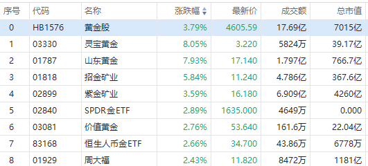 今日黄金港股集体拉升上扬,板块概念指数在近期国际金价飙涨的背景下创出阶段新高。