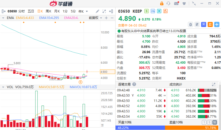 4月3日讯,港股Keep(03650)昨日触底反弹11%,股价今日继续走高,截至发稿,涨8.19%,报4.89港元,成交额3750万港元。