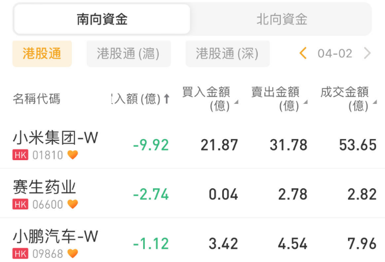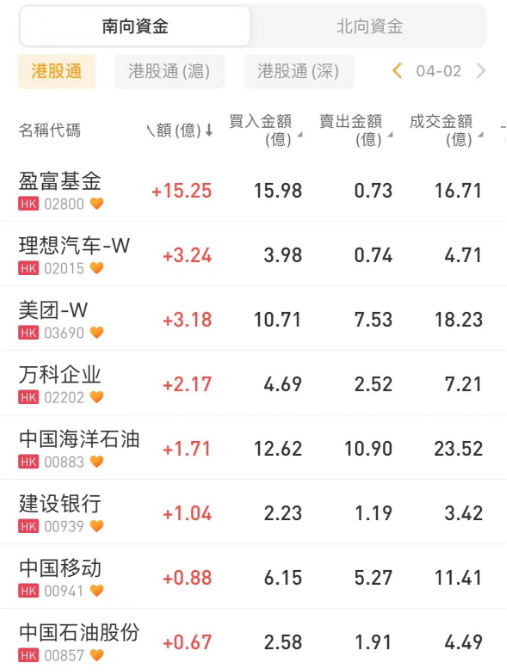 其中,南向资金净买入盈富基金15.25亿港元,理想汽车-W、美团-W分别获加仓3.24亿港元、3.18亿港元;小米集团-W遭净卖出9.92亿港元