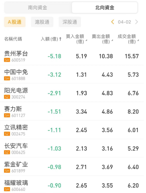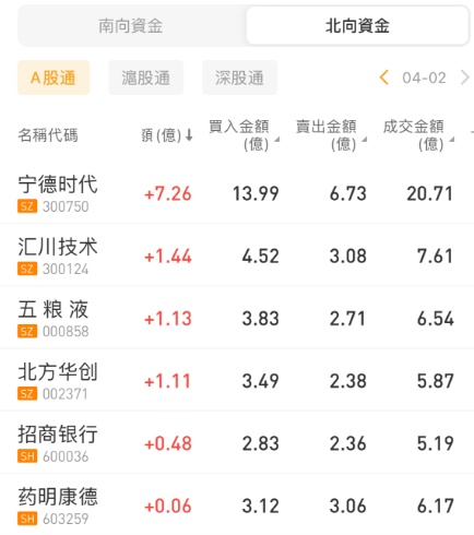 北上资金今日净卖出A股16.18亿元。其中,宁德时代、汇川技术分别获净买入7.26亿元、1.44亿元。贵州茅台净卖出额居首,金额为5.18亿元。