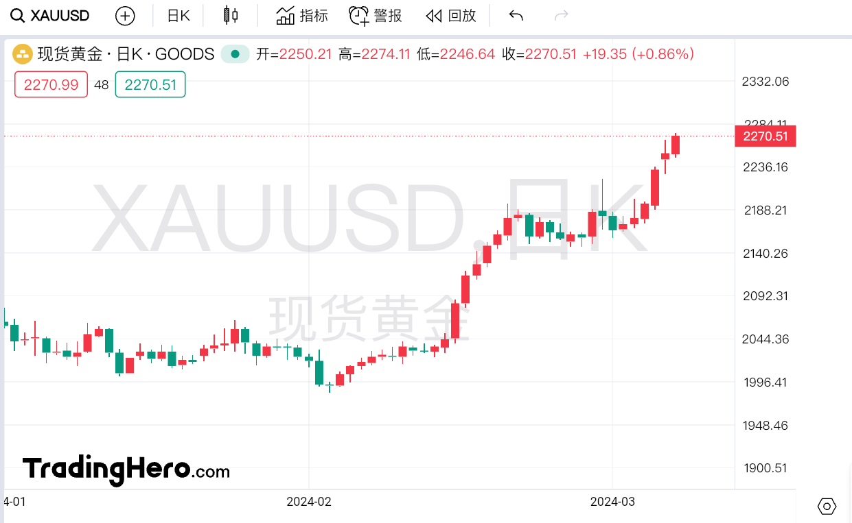 周二,由于动量基金的需求抵消了美国国债收益率走高的影响,现货黄金涨势不止,将纪录高位刷新至2274.11美元/盎司,日内涨近23美元。分析师普遍认为,持续的强势应能使其进一步突破2300美元的整数关口。