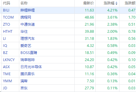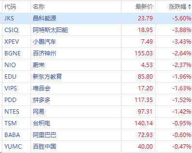 跌幅方面,晶科能源跌超5%,小鹏汽车跌超3%,百济神州、蔚来跌超2%,拼多多跌超1%。