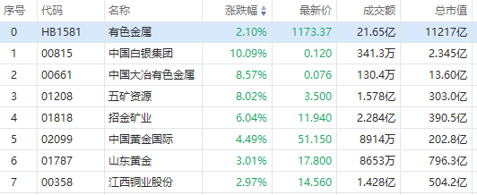 港股铜业股集体上扬,中国白银集团涨超10%,五矿资源(01208)涨8%,江西铜业股份(00358)涨3%,中国铝业涨超2%。