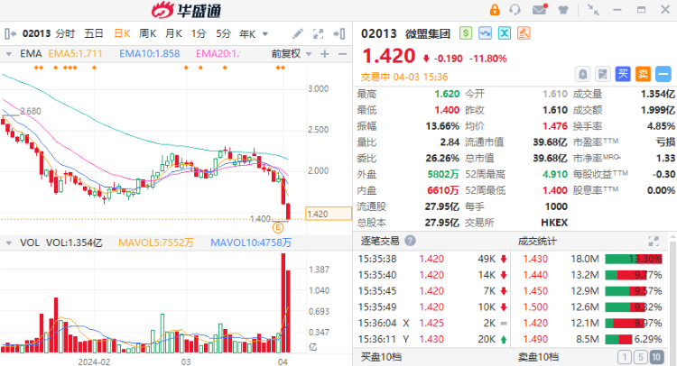 4月3日讯,港股微盟集团今日低开低走再跌逾11%,股价现报1.42港元创历史新低。