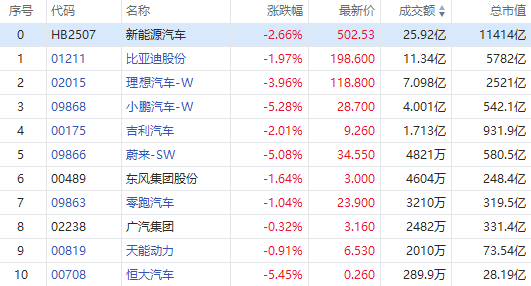 恒生科技指数跌幅午后扩大至2%, 汽车股跌幅扩大,小鹏汽车(09868.HK)、蔚来汽车(09866.HK)均跌超5%,理想汽车(02015.HK)跌超4%,北京汽车(01958.HK)、吉利汽车(00175.HK)等跟跌。