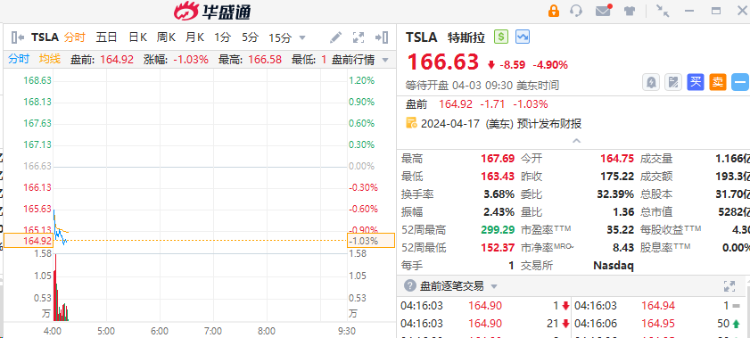特斯拉盘前跌超1%,上一交易日因一季度交付量未达预期而跌近5%。