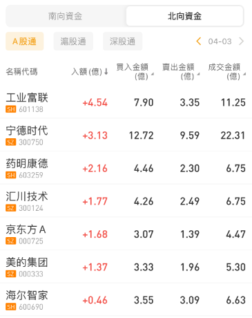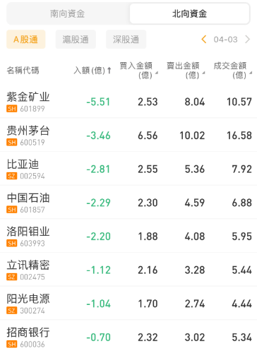 北上资金今日净卖出A股22.75亿元。其中,工业富联、宁德时代分别获净买入4.54亿元、3.13亿元。紫金矿业净卖出额居首,金额为5.51亿元。