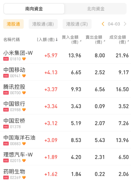 其中,南向资金净买入小米集团-W5.97亿港元,中国移动、腾讯控股分别获加仓4.13亿港元、3.37亿港元;盈富基金遭净卖出4.80亿港元