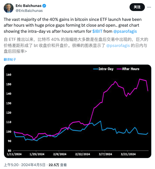 比如,4月4日,比特币在美国交易时间以外上涨约2.6%,而在美国交易时段内仅上涨约0.6%。这一趋势似乎与过去两年相反,因为过去两年大部分涨幅都集中在美国交易时段。ETF分析师Eric Balchunas也在4月5日的X帖子中指出,自1月11日推出现货比特币ETF以来,比特币“40%涨幅中的绝大多数”发生在美国市场的常规交易时间之外。