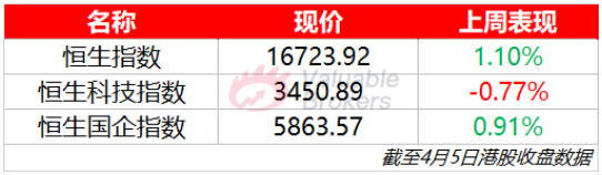 本周恒生指数涨幅1.1%,报16723.92点;恒生科指跌幅0.77%,报3450.89点;国企指数涨幅0.91%,报5863.57点。