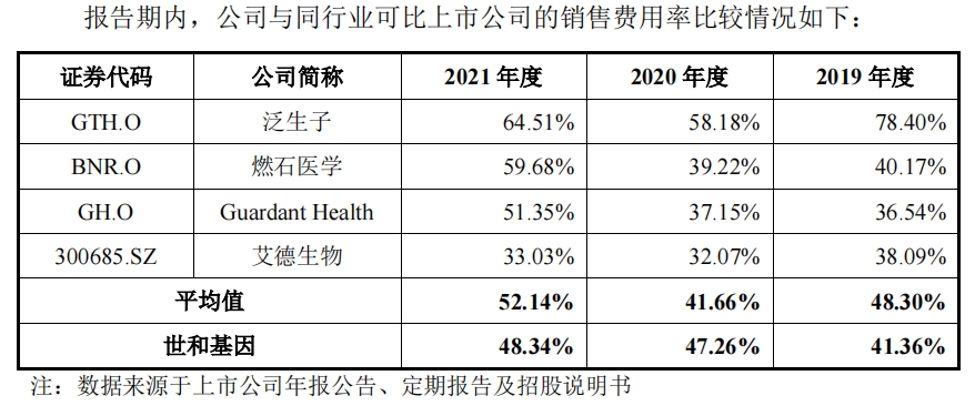 根据招股书,世和基因2019年到2021年3年间,世和基因销售费用分别为1.63亿元、1.92亿元和2.5亿元,各占营业收入41.36%、47.27%和48.34%,与泛生子、燃石医学等同行上市公司的平均水平“总体相当”。