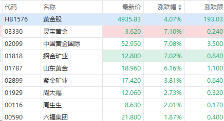 黄金股延续近期涨势,截至发稿,灵宝黄金、中国黄金国际、招金矿业涨超7%,山东黄金涨超6%。