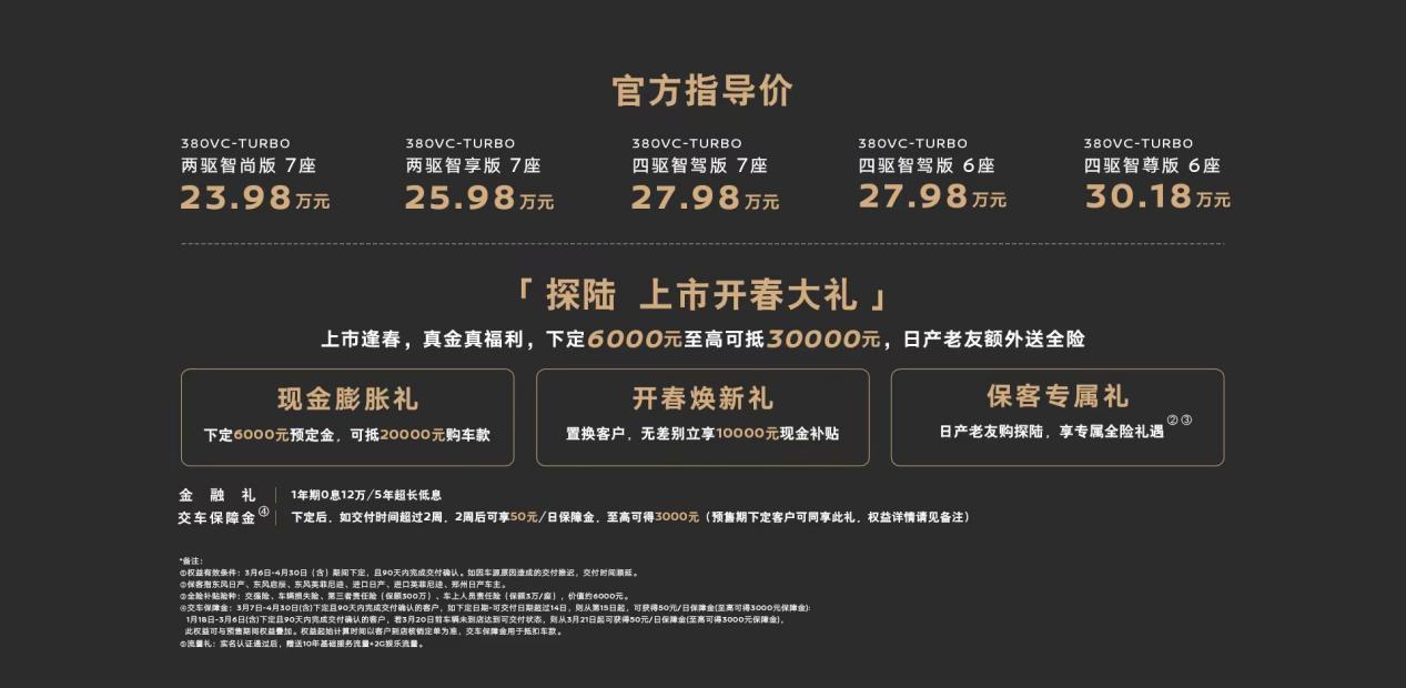 专门为化解大家庭八大高频出行场景的痛点而来,探陆在安全、空间、动力、品质等维度实行高标准、严要求,全力践行“为中国大家庭出行而来”,并在产品力的基础上,给到了优惠的价格和丰厚的礼遇,把“价格战”的战火烧到中大型SUV细分市场,再一次刷新了合资品牌中大型SUV的购买门槛。通过产品力与价格,东风日产再一次向大家庭用户展现了诚意。