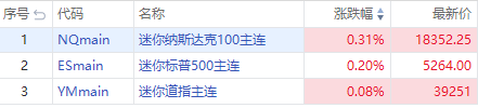 周二三大期指盘前走势分化,截至发稿,纳指期货 $NQmain 涨0.31%,标普500指数期货 $ESmain 涨0.20%,道指期货 $YMmain 涨0.08%。
