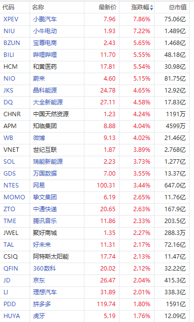 华盛资讯4月9日消息,美股早盘,中概股集体走强,截至发稿,小鹏汽车、小牛电动涨超7%,宝尊电商、哔哩哔哩、蔚来涨超5%,晶科能源、微博涨超4%,万国数据、网易等涨超3%,腾讯音乐、好未来、京东、理想汽车涨超2%,拼多多涨超1%。