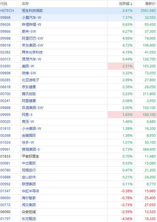 小鹏汽车-W大涨超7%领涨科指,哔哩哔哩-W、蔚来-SW涨超6%,阿里巴巴-SW、京东集团-SW、舜宇光学科技涨超4%,理想汽车-W、美团-W涨超3%。