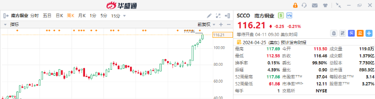 - 南方铜业周涨5.37%;公司是一家铜和其他矿物的综合生产商,在秘鲁和墨西哥经营采矿、冶炼和精炼设施;