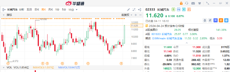 2、长城汽车周涨超26%,公司出海新能源车销量持续高增;花旗维持“买入”评级,目标价上调34.9%至14.7港元