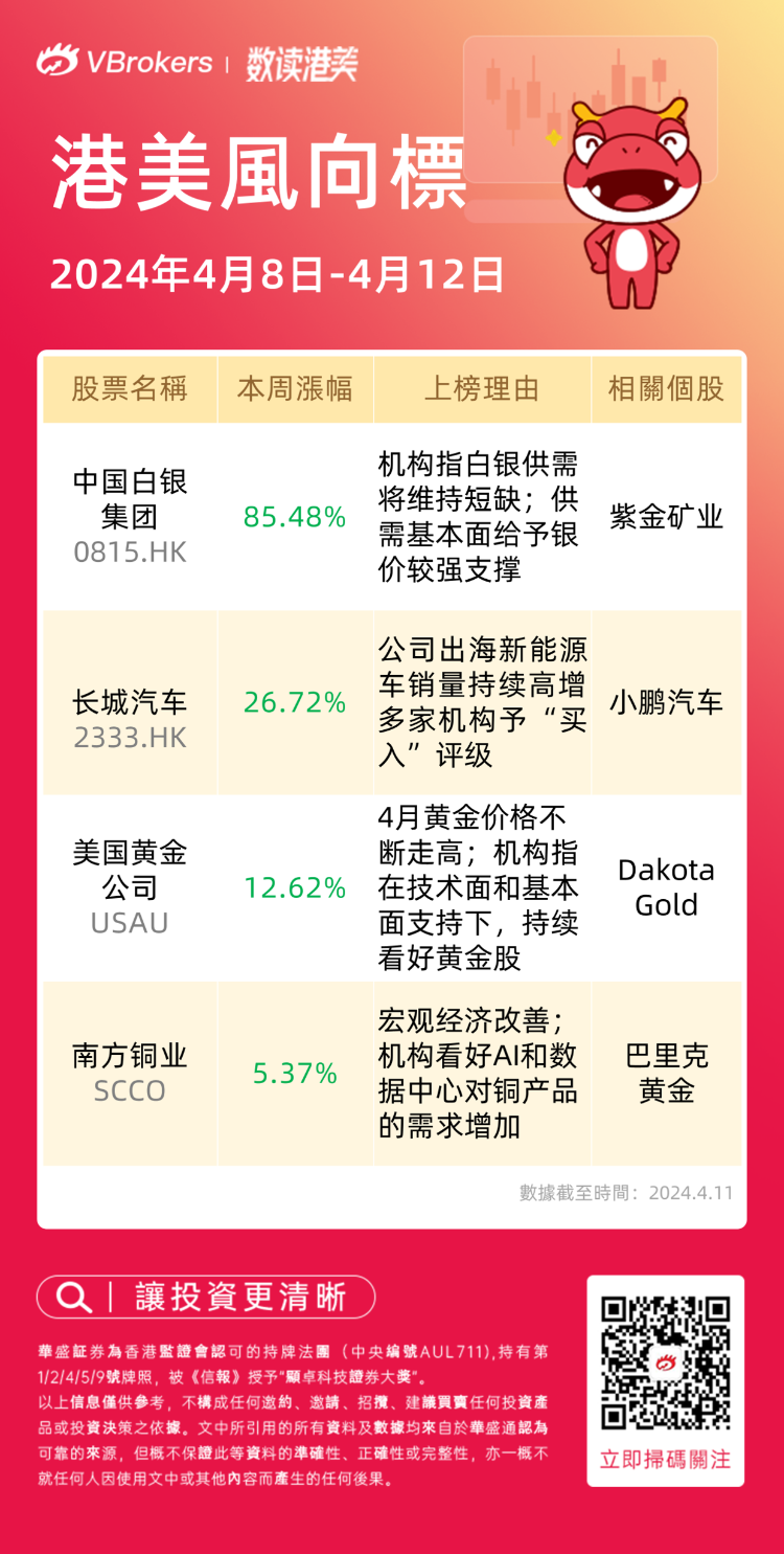 港美风向标 | 金、银、铜携手狂飙!中国白银集团周涨超85%;长城汽车周涨逾26%