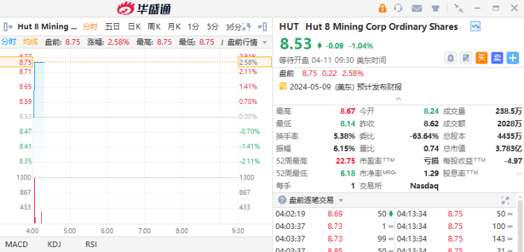 部分加密货币概念股走高,Hut 8 $HUT 涨超2%,Marathon Digital、Riot Platforms盘前涨超1%。