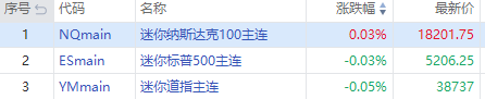 华盛资讯4月11日消息,三大期指盘前走势分化,截至发稿,纳指期货 $NQmain 涨0.03%,标普500指数期货 $ESmain 跌0.03%,道指期货 $YMmain 跌0.05%。