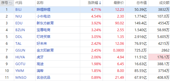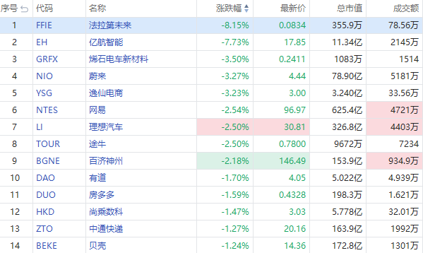 跌幅榜中,法拉第未来跌超8%,亿航智能跌超7%,蔚来跌超3%,网易、理想汽车、百济神州跌超2%,中通快递、贝壳等跌超1%。
