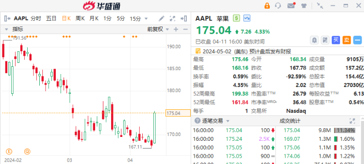截至昨日美股收盘,苹果涨4.33%,创自2023年5月以来最大单日涨幅,报175.04美元。市值单日增加1120亿美元(约合人民币8113亿元),公司总市值达2.7万亿美元。