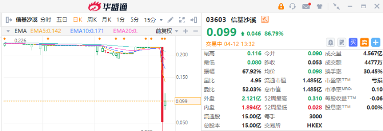 华盛资讯4月12日消息,昨日遭遇暴跌75.69%的信基沙溪在今日复牌后一路高走,一度涨超100%,现报0.099港元,成交4477万港元。