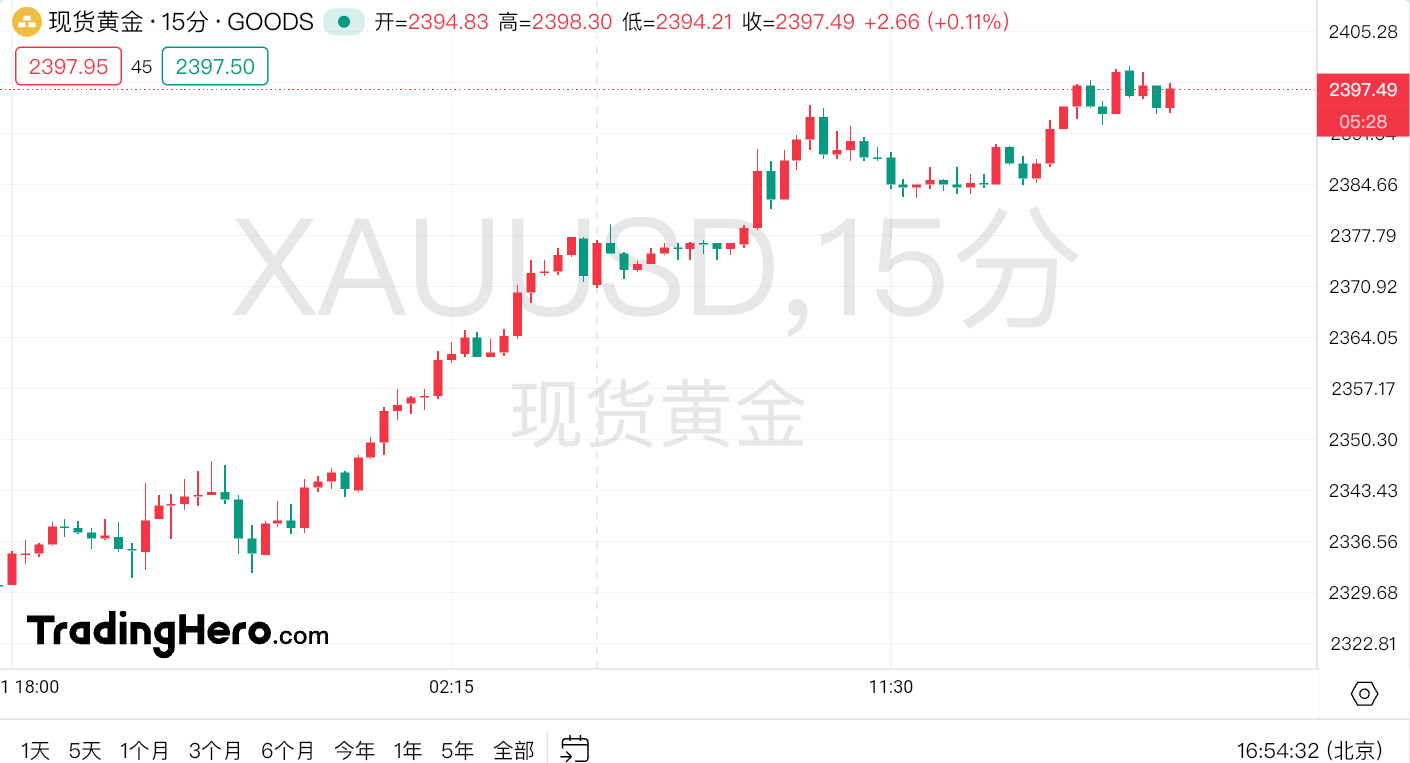周五欧盘,现货黄金延续涨势,触及2400美元大关,11个交易日内,10创新高!虽然黄金价格随后有所回落,但仍徘徊在2400美元附近。分析师表示,这种飙升主要是由中东持续的地缘政治不确定性推动的,这突出了金属作为避险资产的功能。