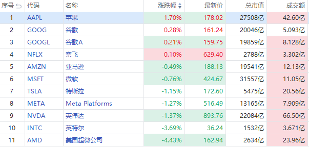 明星科技股多数下挫,美国超微公司跌超4%,英特尔跌超3%,Meta $META 、英伟达、特斯拉跌超1%,微软、亚马逊跟跌;苹果逆市涨近2%,谷歌、奈飞跟涨。