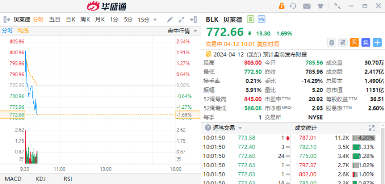贝莱德绩后跌近2%,贝莱德12日发布2024年第一季度财报显示,营收47.28亿美元,上年同期为42.43亿美元,同比增长11%;净利润15.73亿美元,上年同期为11.57亿美元,同比增36%。贝莱德资产管理规模达10.47万亿美元,预计为10.43万亿美元。