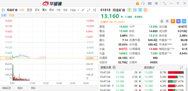 今日港股黄金股并未延续此前的涨势,截至发稿,招金矿业(01818.HK)、灵宝黄金(03330.HK)、山东黄金(01787.HK)、中国黄金国际(02099.HK)分别下跌9.99%、8.17%、4.58%、3.43%。