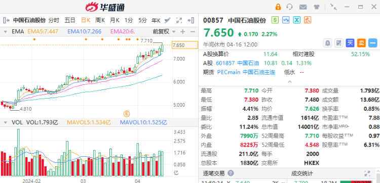 石油股逆势上涨,中石油涨超2%。投资咨询公司Yardeni Research总裁埃德·亚德尼表示,中东冲突的恶化可能会推动油价上涨,布伦特原油价格飙升至每桶100美元。此外,东吴期货指出,在原油基本面较强,美国二次通胀预期逐渐增强的背景下,预计油价总体走势偏强。
