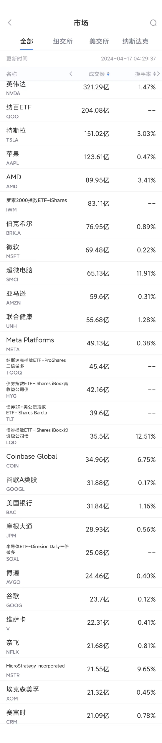 第7名超微电脑收高10.60%,成交65.13亿美元。