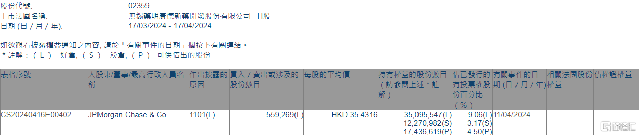 格隆汇4月17日丨根据联交所最新权益披露资料显示,2024年4月11日,药明康德(02359.HK)获JPMorgan Chase & Co.以每股均价35.4316港元增持好仓55.93万股,涉资约1981.6万港元。