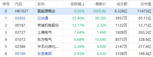 华盛资讯4月17日讯,港股氢能概念股午后涨势扩大,截至发稿,亿华通暴涨35%,现报39.35港元;京城机电股份大涨13.17%,上海电气涨超7%,东方电气涨超6%。