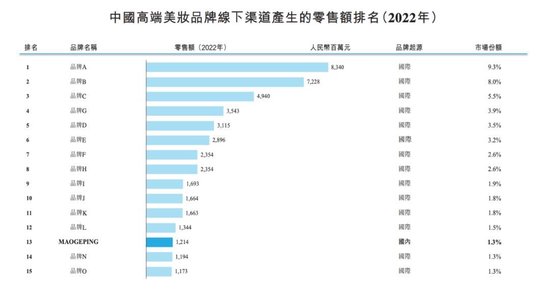 在招股书中,毛戈平引用弗若斯特沙利文的数据称,其是中国市场十大高端美妆集团中唯一一家中国公司,按2022年的零售额排名第八,旗下MAOGEPING是中国市场十五大高端美妆品牌中唯一的国货品牌,按2022年零售额排名第十五。