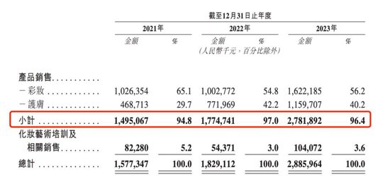 与此同时,比起产品销售,其化妆艺术培训业务,在公司营收中的占比也不高,仅有3.6%。